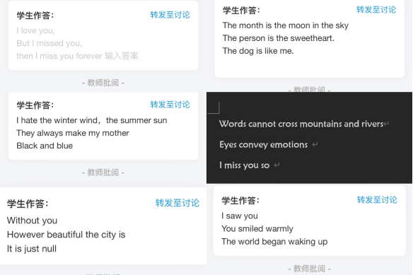 2)在教学方式上,创建线上和线下外语混合式教学新生态,线上利用超星学习通、U校园以及WELearn等学习平台以及动画、音频、图片、文章等,线下丰富课堂活动,从单一因素转向多维因素,遵循听、说、读、写、译并重和“边学边用、学用结合”的原则,设置情景、发布任务、提出问题、发起讨论,学生进行相应的话题演讲、讨论、辩论和戏剧表演等。此案例课程将趣味游戏(头脑风暴、你画我猜等)带入学习活动,便于实现隐性思政育人效果。爱情是永恒的主题,古今中外的诗人们也不吝用大量的妙语佳句描绘爱情的华章。通过诗歌赏析,让心灵徜徉在诗的韵味中,感受字里行间的浪漫与温情。在创作英文三行情诗活动中,大多数同学都能写出对于爱情美好憧憬、对于友情维护珍惜、对于亲情心怀感恩,从小爱到对家国的大爱的一系列作品。通过游戏而非说教的方式实现了隐性思政教育。