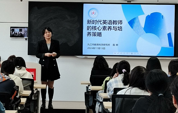 11月13日下午,九江市教育科学研究所初中英语教研员殷晔老师应邀在pp电子游戏平台网站新语堂为参会师生作了题为“新时代英语教师的核心素养与培养策略”的专题报告。九江市第十一中学副校长车蓓蓓、九江一中杨燕老师以及九江外国语学校余小群老师作为嘉宾出席。
