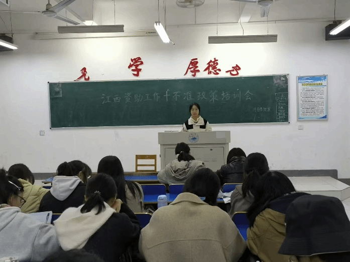 各班评审小组成员参加了此次会议。会议传达了江西省教育厅关于学生资助工作的“十不准”政策,强调了资助工作的重要性和严肃性;详细解读了“十不准”的具体内容,包括不准违反资助金管理办法、不准遗漏家庭经济困难学生、不准在评定过程中搞优亲厚友等,并对每一项规定进行了深入的阐述和案例分析。