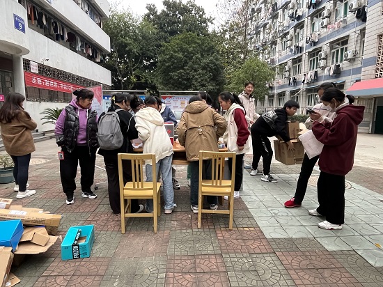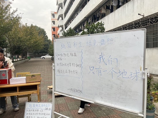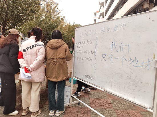在九栋楼下,映入眼帘的是参与活动的同学们早早地准备好绿植等活动物品,该活动的主要环节便是“以旧换绿”,同学们带着“双十一”网购而闲置的纸箱等可回收物品来兑换绿植。现场参加“以旧换绿”的同学们积极参与环保知识答题活动。活动结束,同学们站好最后一班岗,认真打扫场地卫生,整理物品。此次活动获得了同学、老师们的一致好评。