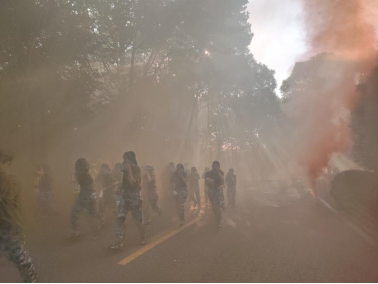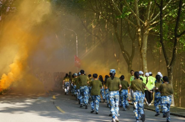 行军绕学校一周全程6公里,沿途设立“穿越火海”“穿越丛林”“穿越毒雾”“勇夺高地”四个特色军事关卡,在西大门舰炮处设立鼓动补给点,通过集体宣誓、闯关夺旗、消防扑火、战鼓助威等多样形式,传承经典战役的伟大精神,鼓舞拉练士气。一路上同学们闯关隘、夺阵地、敬英烈,走一路、练一路、唱一路、学一路……在金工实验楼前,前进道路被熊熊大火阻拦,尖刀连按照消防演练预案,顺利扑灭大火,掩护队伍迅速通过,后勤保障队快速打扫战场,消除行军痕迹。在阳明山,竹密草杂坡陡,同学们矫健如虎,破拆障碍,越过丛林。在状元桥,队伍兵分两路,两个连队比赛抢占两门舰炮。面对巍巍舰炮,同学们军容整体,嘹亮的口号“全民国防,强国有我”充分展现了新时代大学生与祖国奋进的决心与勇气。战鼓催征,队伍行进至紫阳路大拐弯,敌人开展毒气弹袭击,同学们用帽子、湿毛巾捂住口鼻,快速冲出毒雾。最后一公里,队伍变化为战斗队形,个个奋勇争先,冲上新校区71.2高地夺取胜利的旗帜。