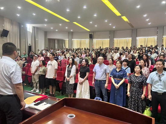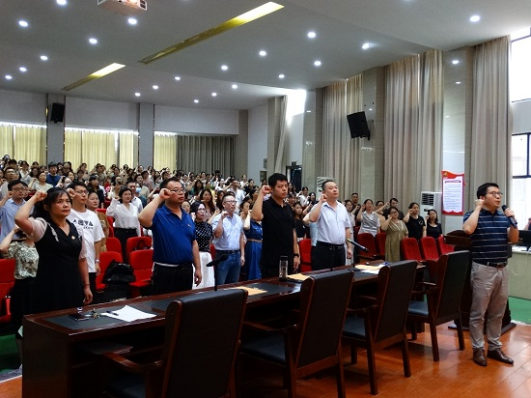 大会最后,在周志高教授的带领下,新教师高茂原以及全体老教师庄严宣誓:我志愿成为一名人民教师,忠诚党的教育事业,遵守教育法律法规,履行为党育人、为国育才的职责......