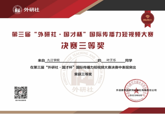 近日,由外研社主办的第三届“外研社·国才杯”国际传播力短视频大赛圆满落幕并公布了获奖名单,由pp电子游戏官网日语专业师生组成的团队积极参加比赛,最终以作品“中国人物—朱熹”喜获全国三等奖。团队成员分别是杨文蕾、赵蓝图、刘艺、黄欣悦、叶芷乐五位学生。日语小语种教研室主任陈德超博士、专任教师孙旭博士获得本次比赛指导教师三等奖。