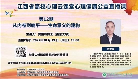 为了更好的适应大学生活,特别是在后疫情时代如何更好的规划好大学学业,让大学生活充实而有意义,10月19日晚上,pp电子游戏平台网站组织学生观看了江西省高校心理云课堂心理健康公益直播课第十二期:“从内卷到躺平--生命意义的建构”。