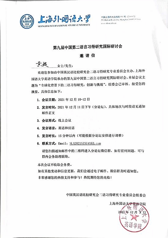 近日,由中国英汉语比较研究会二语习得研究专业委员会主办、上海外国语大学英语学院承办的第九届中国第二语言习得研究国际研讨会在上海外国语大学举办,本次会议的主题为:全球化背景下的二语习得研究:创新与挑战。pp电子游戏官网黄甦博士向会议投稿,并作主题报告,获得与会专家们的认可。