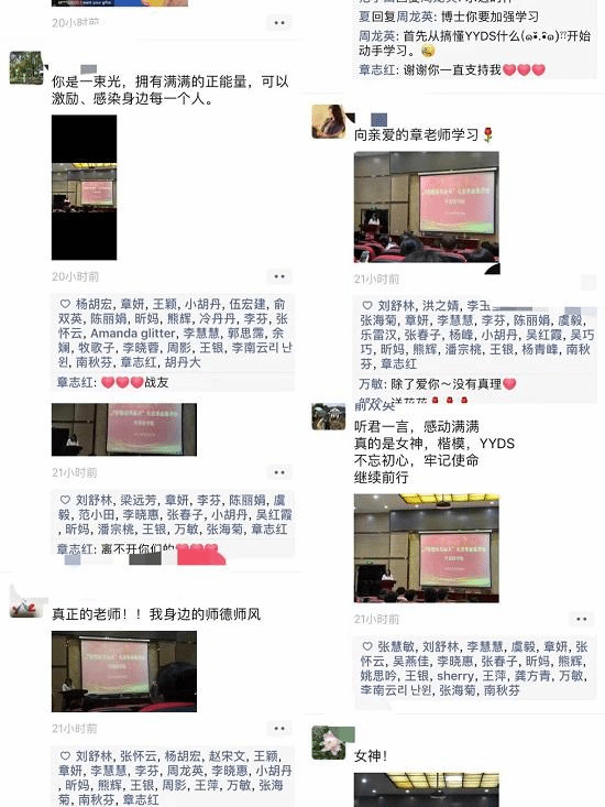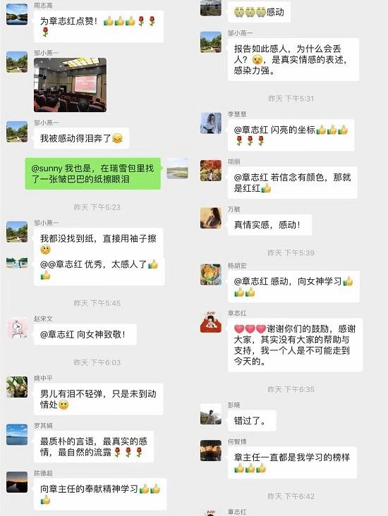 章志红的报告朴实无华,情感真挚,引起了全院上下的强烈反响。报告结束后,工作群、朋友圈都在传颂她的感人事迹,在全院范围内掀起了“向章志红同志学习”的热潮。老师们纷纷表示“章志红老师就是我身边的榜样,是最最闪亮的坐标”“章志红老师是一束光,拥有满满的正能量,可以激励、感染身边每一个人”......