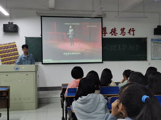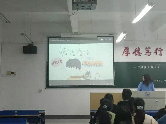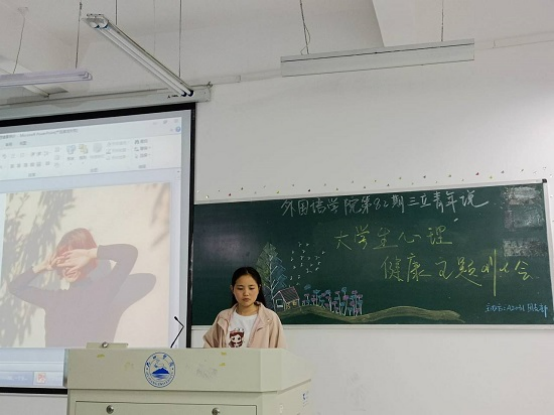 会上各个班级参与的十分活跃,PPT形式主题电影的欣赏,寓教于乐,仅仅通过几个很简短但有趣的心理小故事,就介绍了大学生常见的比如学业压力,情感问题,抑郁症,焦虑症,环境无法适应等心理问题的表现以及解决措施,我们外语学院每个班级都配备了一名心理委员,同学如果心理上出现了状况就可以和心理委员去沟通,同时心理委员也会及时带着同学去校心理办公室咨询求助。