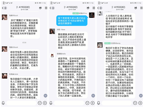随后,同学们便进行了学习心得的分享,并结合当前疫情形势和防控要求积极交流感悟。A1842班同学们就“我们的中国梦是什么?”“社会主义核心价值观内容是什么?”“对于诚信,我们能做些什么?”进行问题抢答,线上班会气氛十分活跃。团支部书记提出几点要求:当前疫情还未完全结束,同学们还应认真对待学院发布的个人每日健康打卡,如实报告,诚信打卡;诚信打卡不仅是个人的责任,更是对他人和国家负责的行为;期末考试即将到来,同学们应坚守诚信考试准则,做诚信大学生,构建诚信校园。