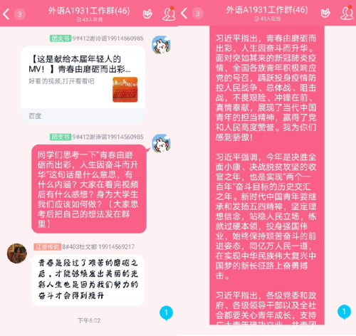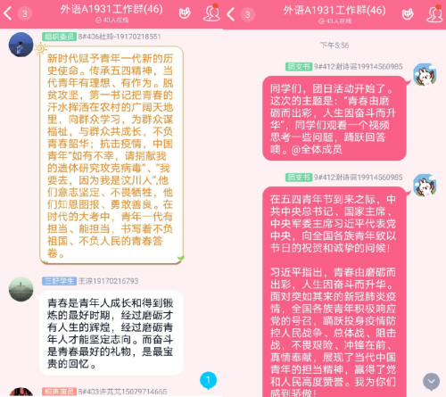 吾辈中国,青年奋起。为纪念“五四运动”101周年,贯彻落实习近平总书记寄语新时代青年的讲话精神,让广大团员切身认识到五四精神的重要性,让中国精神焕发光彩、薪火相传,5月7日pp电子游戏平台网站大一年级各班运用微信、腾讯QQ等平台,以在线共同观看视频、讨论相关图片等形式开展了以“青春由磨砺而出彩,人生因奋斗而升华”为主题的线上团日活动。