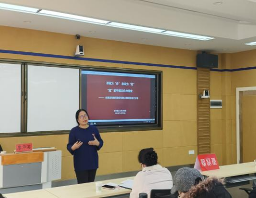 廖华英教授以主讲课程《中国文化概况》为例,详细介绍了课程概况、课程目标、建课历程、学情分析、课程痛点、课程育人体系设计等方面,并结合丰富的教学案例向学院教师展示,在建课和实际教学过程中如何践行以学生为中心,坚持立德树人根本任务,以产出为导向,以教师为关键,创新实现“润物细无声”的课程育人理念。她提出课程设计要注意突出校本特色和课程特色,注重挑战性和深度,建设过程中要充分发挥教研室、团队和行业专家的群体智慧,发扬工匠精神认真打磨教学设计。在互动环节,廖教授与在场教师就课程建设的重难点、课程思政元素融入、一流课程项目设计等话题展开深入探讨。与会教师纷纷表示受益匪浅。