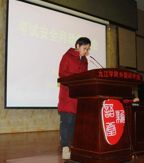 王少斌老师对考试安全月工作的具体要求做了详细说明和安排,学生会主席团成员胡飞宇作为学生代表进行了表态发言和宣誓。
