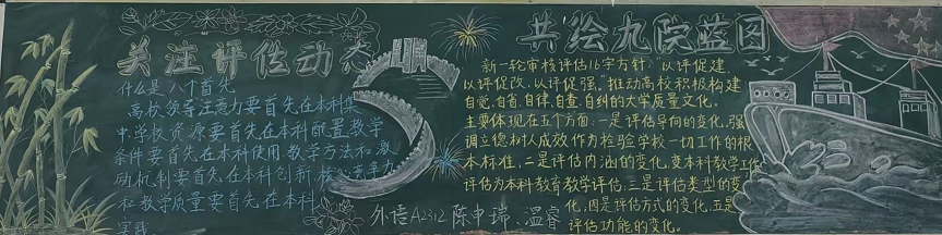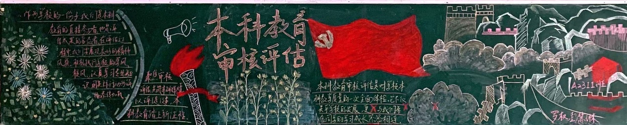 为进一步加强本科教育教学审核评估知识的学习宣传力度,营造学生积极参与审核评估活动的浓厚氛围,pp电子游戏平台网站通过更新宣传栏、组织开展本科教育教学水平评估知识黑板报评比等方式,进一步强化学习宣传力度。各班级黑板报作品精彩纷呈,在色彩运用、文字内容、布局排版等方面突显了同学们对本科评估工作的深刻理解和创意表达。