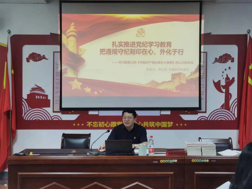 周志高为支部党员们带来了一节精彩纷呈的纪律党课,带领大家一一回顾了《中国共产党纪律处分条例》的演变及重要意义,并结合教师党员的工作实际诠释了条例的主要内容。大家纷纷表示这是一堂严肃活泼的党课,讲解深入浅出,帮助大家进一步深化了对党纪学习教育的认识,促使党员同志们学纪、知纪、明纪、守纪。周志高为13名党员颁发了政治生日贺卡和学习书籍,并带领支部全体党员重温了入党誓词,勉励新老党员们勿忘入党初心,牢记自己的身份与责任,永葆党员的政治热情、自豪感和使命感。
