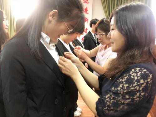 老党员们为新党员们佩戴党徽
